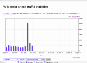 Отметим, что обычно украиноязычную версию Википедии в день посещают в среднем 20-25 тысяч раз, однако во вторник, 10 июля, на сайте побывали 103 886 раз. …Как сообщает украинская общественная организация «Викимедиа», эти показатели свидетельствуют о том, что отечественная Википедия имеет бол…