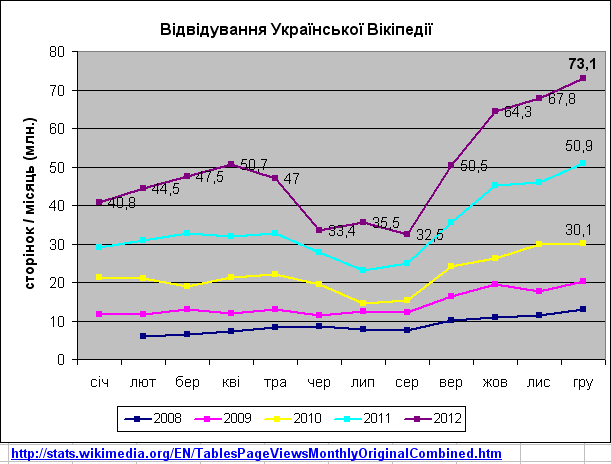 Динаміка відвідування української Вікіпедії (переглянуто сторінок за місяць)
