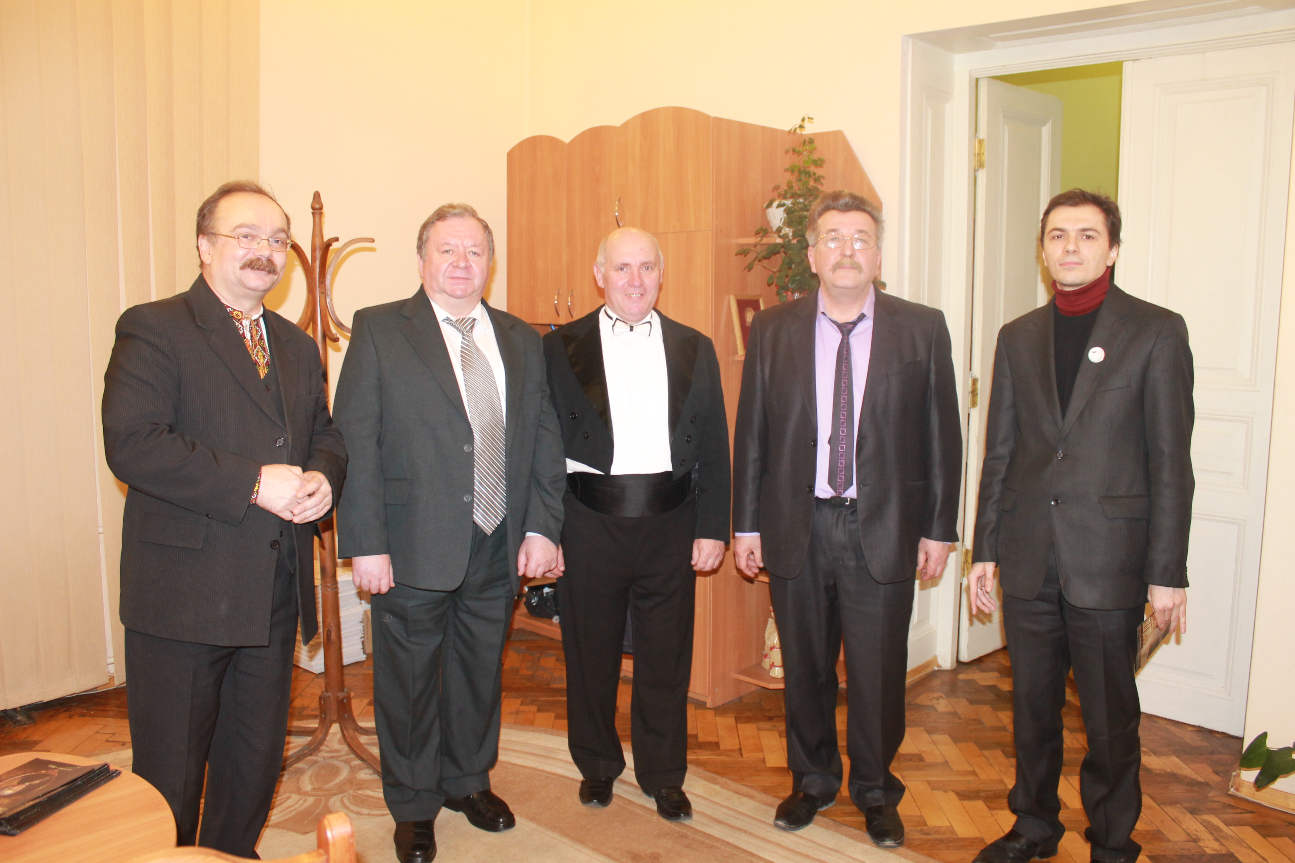 Після концерту (зліва направо) – видавець Святослав Сурма, директор Дрогобицького музичного училища Микола Ластоцевький, диригент Микола Михаць, директор театру Микола Гнатенко, заступник голови Правління “Вікімедіа Україна” Андрій Бондаренко. Фото – Анна Кручай