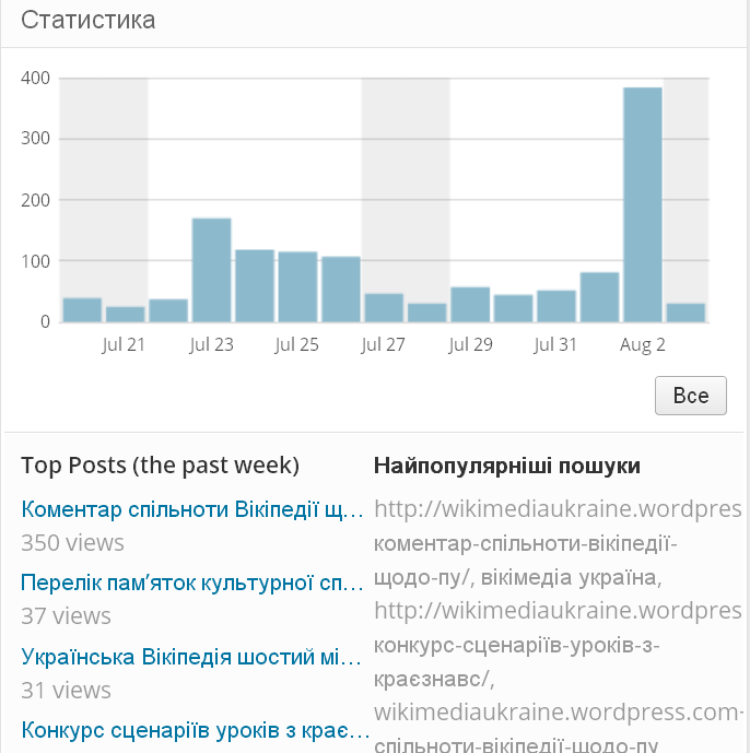 Публікація «Коментар спільноти Вікіпедії щодо публікацій в медіа про вилучення статей про УПА» здобула рекордне з часу існування блога ВМУА число відвідувань протягом одного дня.