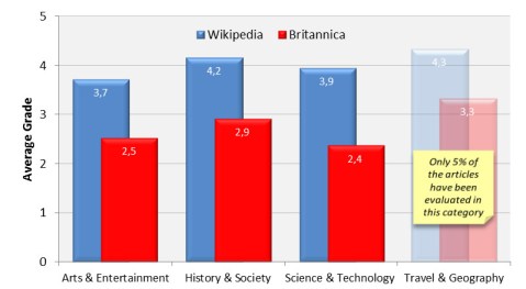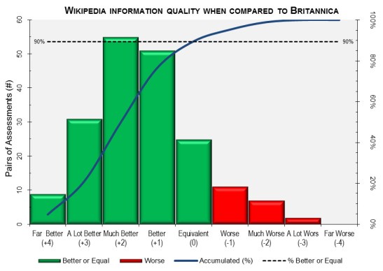 На думку португальських експертів 90% статей в англомовній Вікіпедії кращі або не поступаються аналогічним в енциклопедії Британіка. Такого висновку дійшли науковці університету міста Евора. Для порівняння дослідниками було взято 245 пар статей з англомовної Вікіпедії та енциклопедії “Британіка”. Кожна зі статей була попередньо відформатована таким чином, щоб неможливо було зрозуміти її джерело і представлена на розгляд експертам у відповідних галузях для оцінки за п’ятибальною шкалою. Експертам було запропоновано оцінювати лише точність і об’єктивність статті. Статті були розділені на 4 основні категорії: “Мистецтво і розваги”, “Історія і Суспільство”, “Наука і Технологія” та “Подорожі і Географія”. Для останньої, щоправда, в університеті не знайшлося достатньої кількості експертів і лише 5% статей в цій категорії були оцінені.