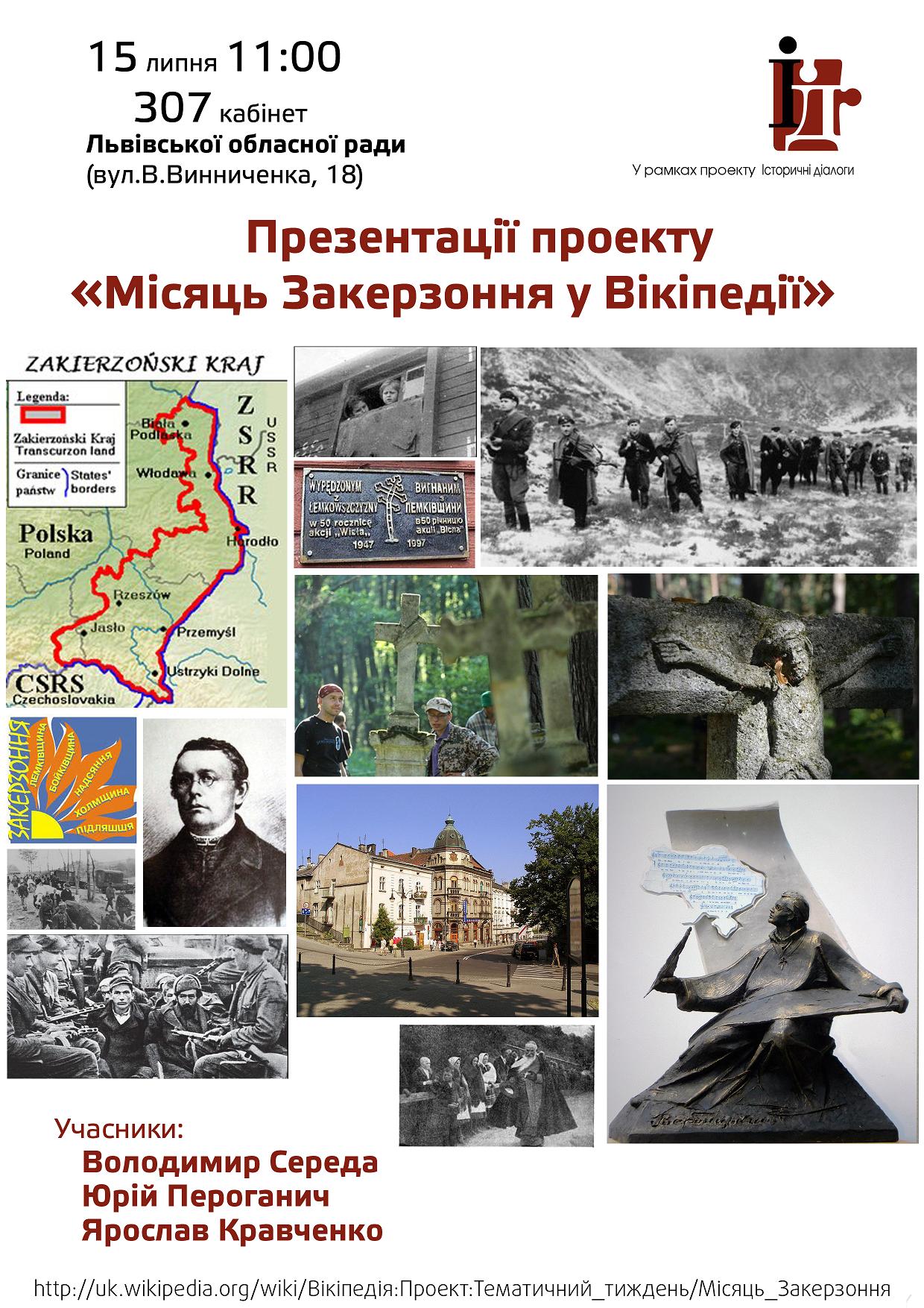 15 липня 2014 об 11:00 у 307 кабінеті Львівської обласної ради відбудеться прес-конференція щодо презентації проекту «Місяць Закерзоння у Вікіпедії». Проект приурочений 70-тій річниці від початку депортації українців із Закерзоння, яка розпочалась 9 вересня 1944 р. Захід відбудеться у рамках проекту «Історичні діалоги».