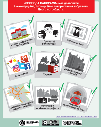 Очевидно, що «свобода панорами» — це про свободу загалом, принаймні про свободу від юридичної відповідальності за абсолютно безвинні діяння. Чому «свобода панорами» настільки важлива для нас всіх та для Вікіпедії зокрема? У першу чергу тому, що ми прагнемо використовувати матеріали, розповсюдження яких не обмежується власниками авторських прав. Ми виступаємо за вільні знання, так само як і за вільний обіг фото- та відеоматеріалів, тому публікуємо лише ті твори, що були визначені як вільні в усіх площинах: від освітньої до комерційної. Чинне законодавство, на жаль, не дозволяє Вікіпедії вільно використовувати фото та відео творів архітектури на своїх ресурсах. Як і тобі, читачу. На превеликий жаль, цей юридичний абсурд — реальність, у якій нам доводиться жити.