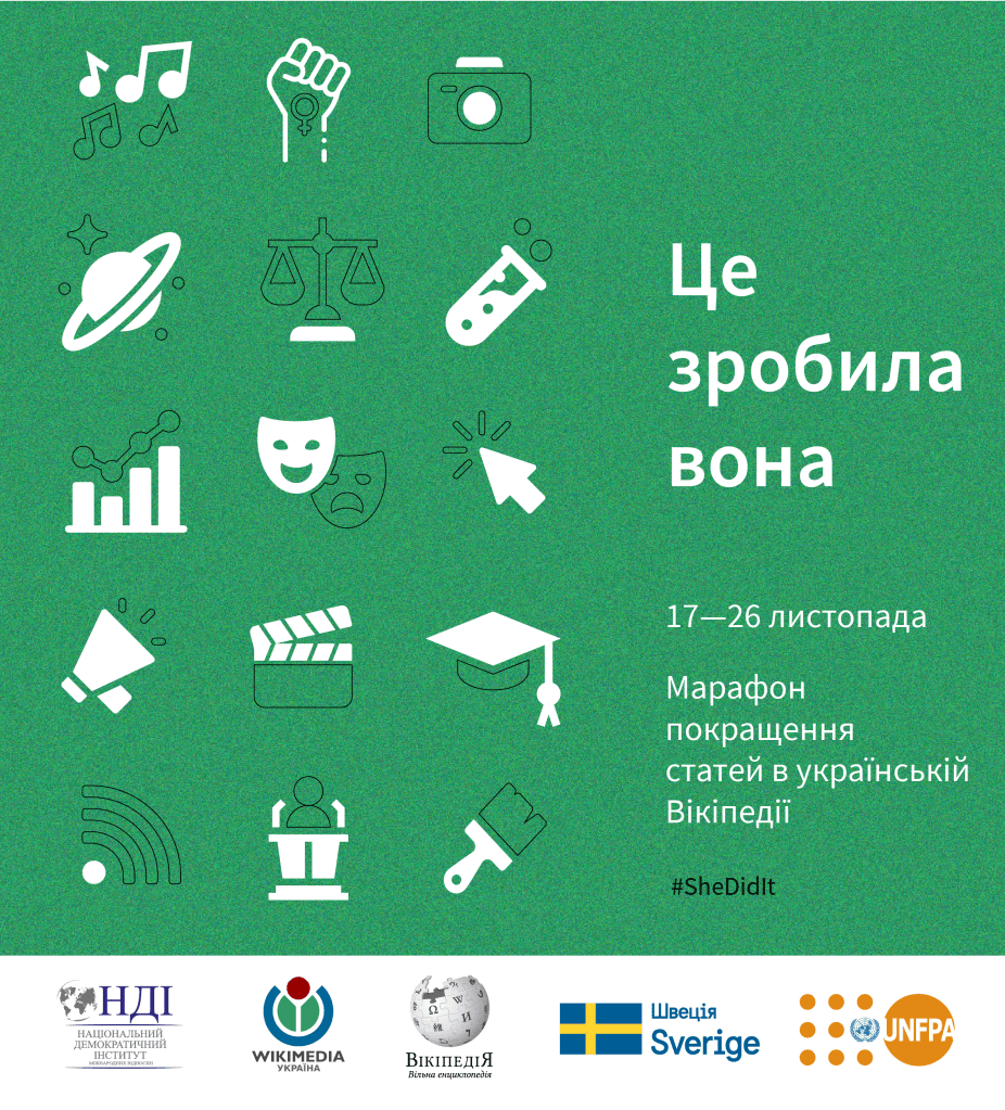 17—26 листопада в українській Вікіпедії проходить марафон «Це зробила вона», присвячений покращенню статей про видатних жінок для досягнення більшої рівності в онлайн-енциклопедії.