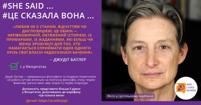 «Дуже цінно, що учасниці й учасники марафону звернули увагу на важливі й відомі у сучасному світі, але відсутні в українських Вікіцитатах жіночі голоси. Тепер користувачі ресурсу зможуть дізнатися, як бачать співпрацю з Україною політичні лідерки Камала Гарріс і Мая Санду. Як привертає увагу до проблем довкілля екофеміністка Вангарі Маатаї чи яке пояснення гендеру пропонує філософиня Джудіт Батлер.