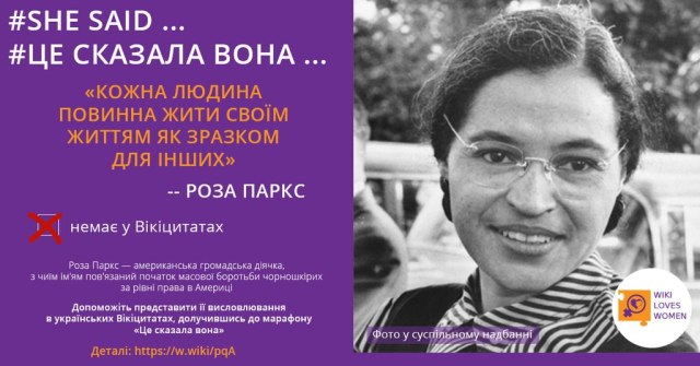 У грудні 2020 року в українських Вікіцитатах пройшов марафон «Це сказала вона». Протягом двох тижнів усі охочі запрошувалися створювати й доповнювати статті з висловлюваннями видатних жінок.
