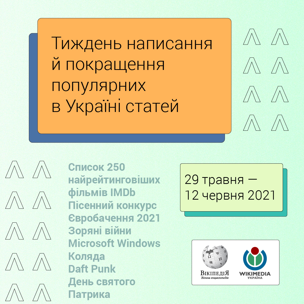 З 29 травня до 12 червня у Вікіпедії українською мовою триває «Тиждень популярних в Україні статей». Він присвячений написанню й покращенню українською мовою статей, які користувачі на території України частіше переглядають у російськомовному розділі Вікіпедії. Долучитися до акції можуть усі охочі.
