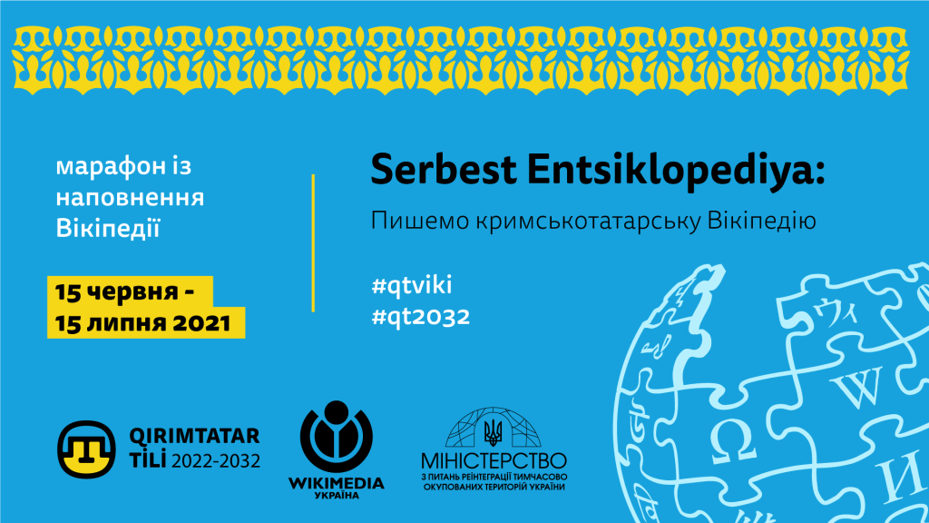 Із 15 червня до 15 липня запрошуємо усіх охочих долучатися до марафону «Serbest Entsiklopediya: Пишемо кримськотатарську Вікіпедію». Його проводять Міністерство з питань реінтеграції тимчасово окупованих територій України та ГО «Вікімедіа Україна», метою марафону є наповнити кримськотатарський мовний розділ статтями на найважливіші теми.