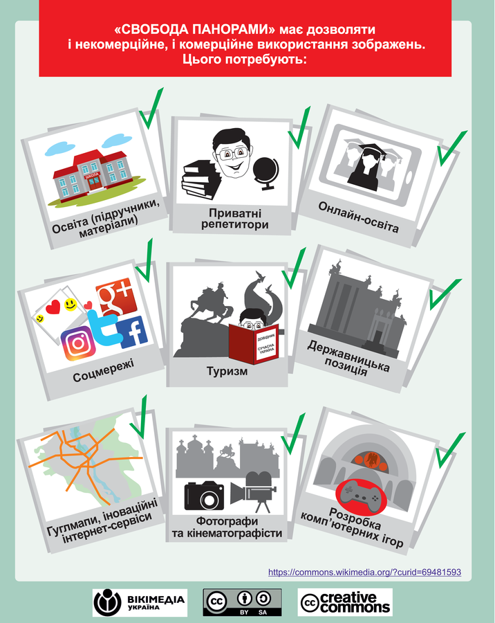 На початку червня цього року на сайті Верховної Ради України з’явилось цілих п’ять законопроєктів зі змінами до закону «Про авторське право та суміжні права» — 5552, 5552-1, 5552-2, 5552-3, 5552-4. Майже всі містять положення про «свободу панорами» та в різній мірі захищають інтереси інтернет-користувачів. Для Вікіпедії та низки інших інтернет-ресурсів це питання є важливим, тому що через відсутність «свободи панорами» в Україні у Вікісховище (централізоване сховище медіафайлів, які можуть використовуватися зокрема й для ілюстрування Вікіпедії) заборонено завантажувати зображення творів архітектури та мистецтва, які не перебувають у суспільному надбанні чи без письмового дозволу авторів. Яскравий приклад — будівля Верховної Ради України, для фотографування якої потрібен дозвіл спадкоємців архітектора Заболотного.