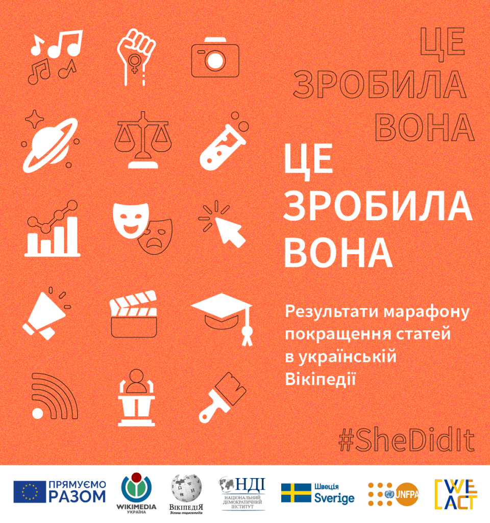 У листопаді в україномовному розділі Вікіпедії пройшов марафон «Це зробила вона». Понад тридцять учасників та учасниць поліпшили близько 250 енциклопедичних статей про спортсменок, дипломаток, громадських діячок, науковиць та інших видатних жінок.