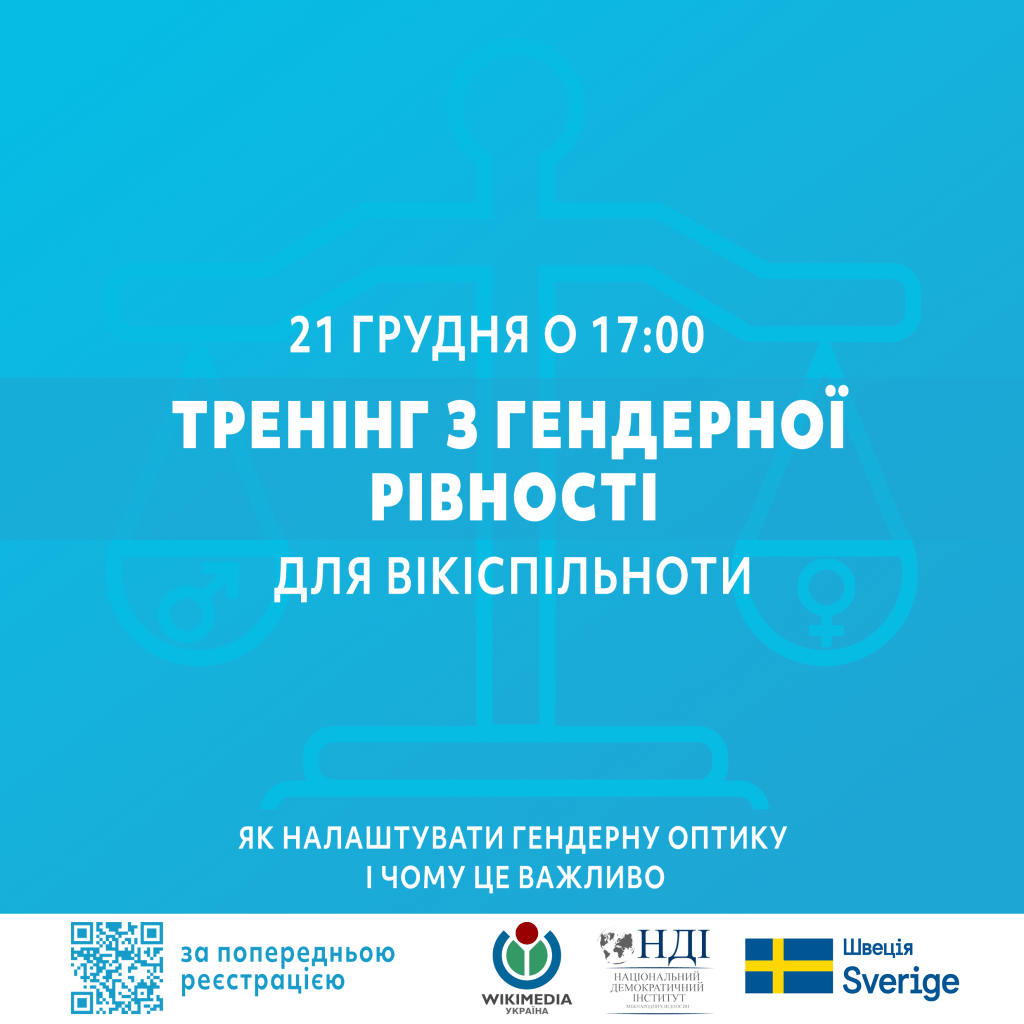 Тому у вівторок 21 грудня о 17:00 ГО «Вікімедіа Україна» та Національний Демократичний Інститут (НДІ) проведуть тренінг для вікіспільноти, присвячений гендерній рівності. Тренінг став можливим завдяки фінансовій підтримці Швеції.
