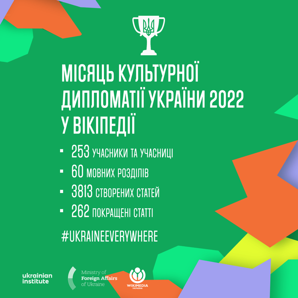 У лютому—березні 2022 року у Вікіпедії вдруге проходив «Місяць культурної дипломатії України». Він був спрямований на створення і покращення статей про Україну та українську культуру якомога більшою кількістю мов. Про детальні результати цієї кампанії розповідаємо у цьому дописі.
