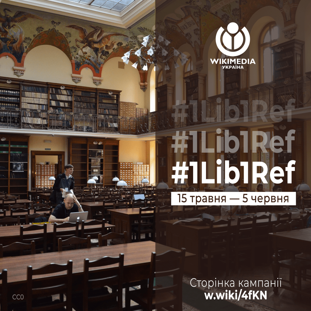 Запрошуємо бібліотекарів, бібліотекарок та всіх охочих долучитися до міжнародної акції #1Lib1Ref в українському розділі Вікіпедії, що триватиме синхронно із світом — з 15 травня до 5 червня. Її метою є покращити перевіреність фактів у Вікіпедії та допомогти наповнити найбільшу онлайн-енциклопедію посиланнями на авторитетні джерела.