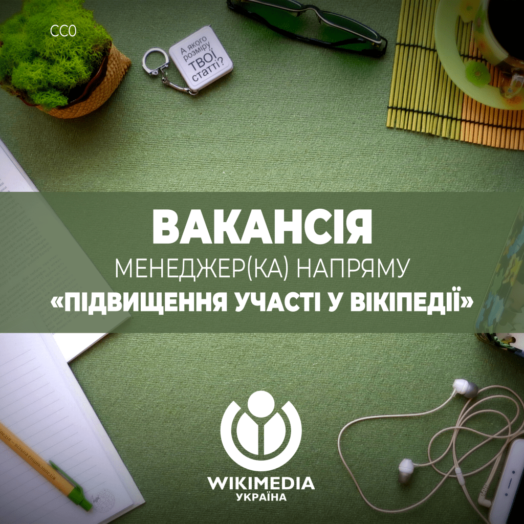 Громадська організація «Вікімедіа Україна» оголошує конкурс на вакансію менеджера / менеджерки напряму «Підвищення участі у Вікіпедії». Позиція передбачатиме координацію Освітньої програми Вікіпедії в Україні та кампаній, спрямованих на залучення нових волонтерів-редакторів до Вікіпедії та її сестринських проєктів.