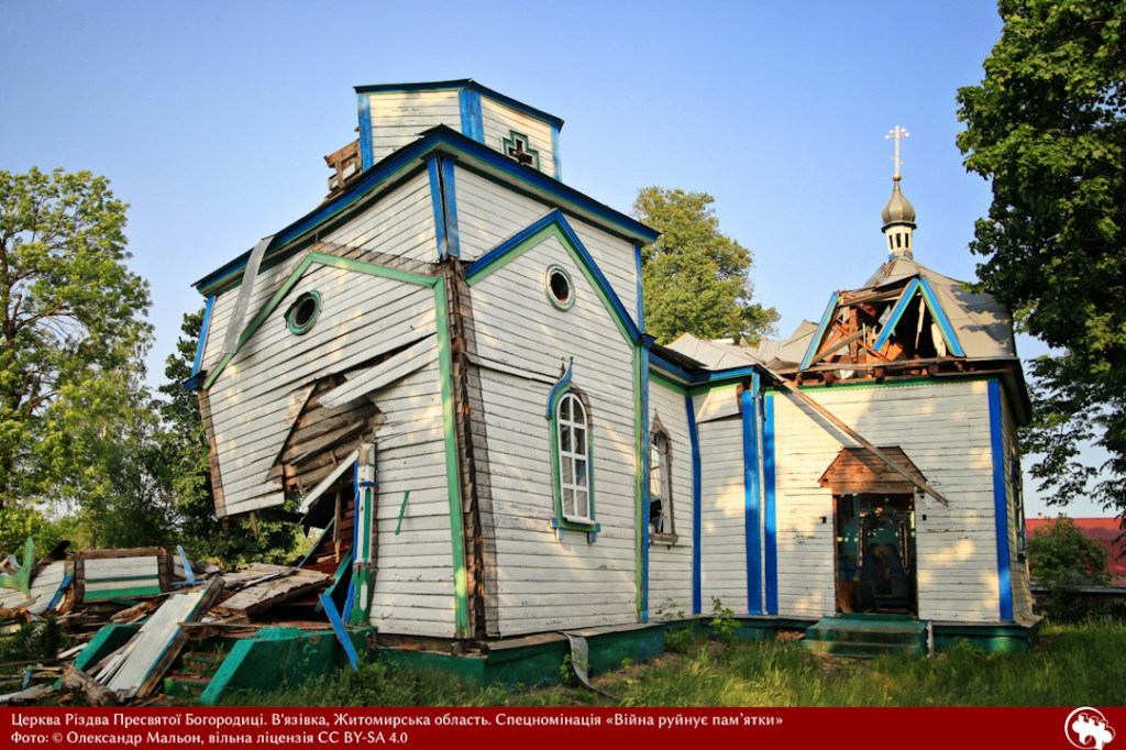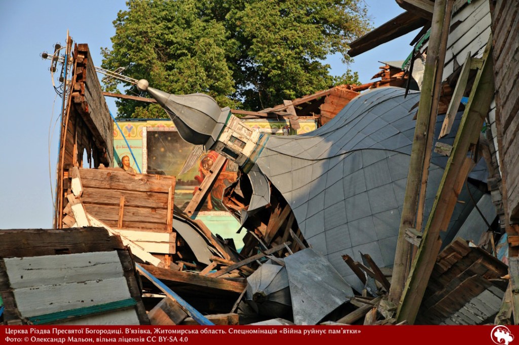 На першому місці серія фотографій руїн дерев’яної церкви Різдва Пресвятої Богородиці у селі В’язівка Житомирської області. Церква знищена внаслідок російського обстрілу 7 березня 2022 року. Автор світлин — Олександр Мальон.