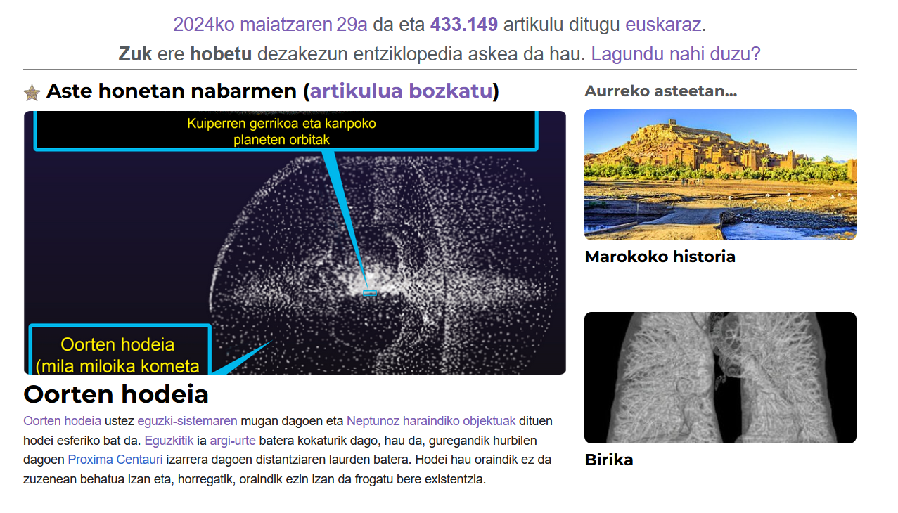 Головна сторінка баскської Вікіпедії не настільки відвідувана — вона має приблизно 1700 відвідувань на день, і це найвідвідуваніша сторінка баскської Вікіпедії. Але баскська Вікіпедія має інші чудові проєкти, наприклад Ikusgela, освітній відеопроєкт, або Txikipedia, енциклопедія для дітей. Нещодавно баскська Вікіпедія стала 33-ю Вікіпедією за кількістю статей, і спільнота представила абсолютно новий дизайн, який вміщує більше інформації та має акцент на інтерактивності.