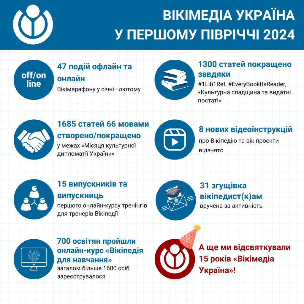 Близько 1300 статей українською було створено та покращено завдяки трьо кампаніям для бібліотекарів(-ок). Протягом весни 2024 року, «Вікімедіа Україна» підтримала три конкурси: #1Lib1Ref, #КожнійКнизіСвійЧитач та щорічну акцію «Культурна спадщина та видатні постаті»