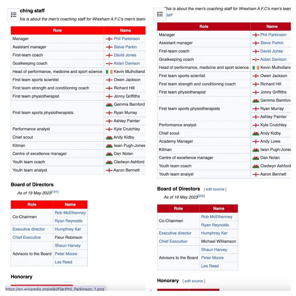 Коли ми почали оцінювати потенційні розв’язання проблем із кольором, що описані вище, ми звернулись до Рекомендацій щодо доступності вебвмісту та контрасту кольорів. Ми це зробили, щоб визначити, на яких сторінках наявні кольори та комбінації кольорів, які можуть ускладнити читання. Виявили, що багато статей у Вікіпедії мали проблеми з доступністю контенту в попередньому «лише світлому» стані Вікіпедії. Стаття Wrexham A.F.C., наприклад, мала недоступний червоний фон у всіх заголовках таблиць лише тому, що футбольна команда грає в червоному (наразі це виправлено!).