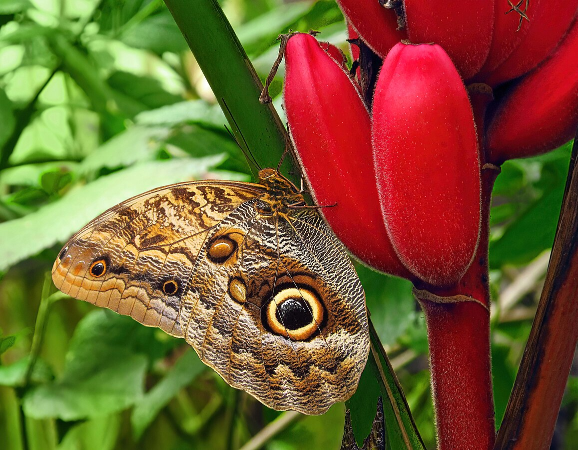 Світлина Метелика Caligo brasiliensis sulanus на плоді дикого червоного банану. Автор — Дмитро Леонтьєв, 1 місце у номінації 2023 року.