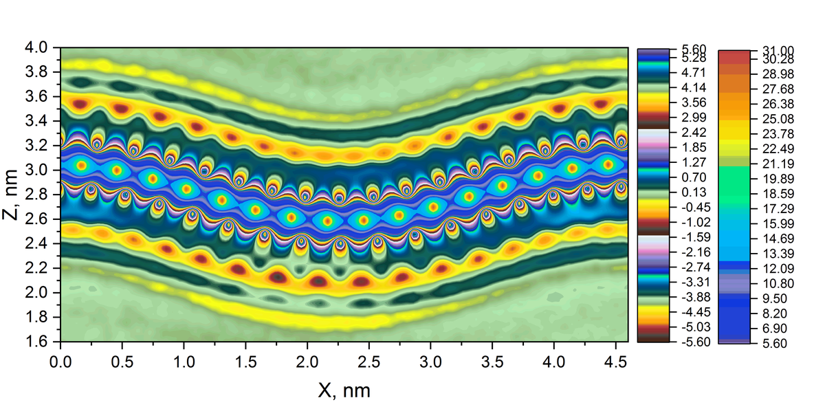 Електростатичний потенціал навколо викривленого сольватованого моношару MoS2. Автор — Семен Єсилевський, 3 місце у номінації 2021 року.