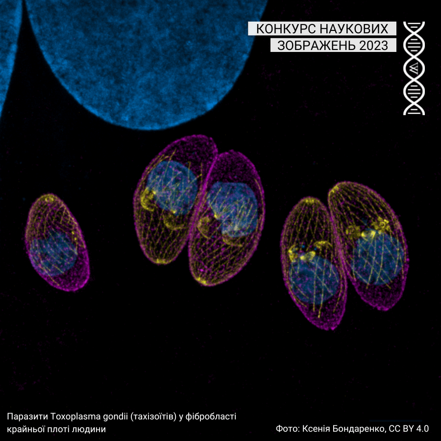 Третє місце у категорії «Мікроскопія» посіло зображення п’яти паразитів Toxoplasma gondii (тахізоїтів) у фібробласті крайньої плоті людини, отримане за допомогою ультраструктурної розширювальної мікроскопії. Авторка — Ксенія Бондаренко.