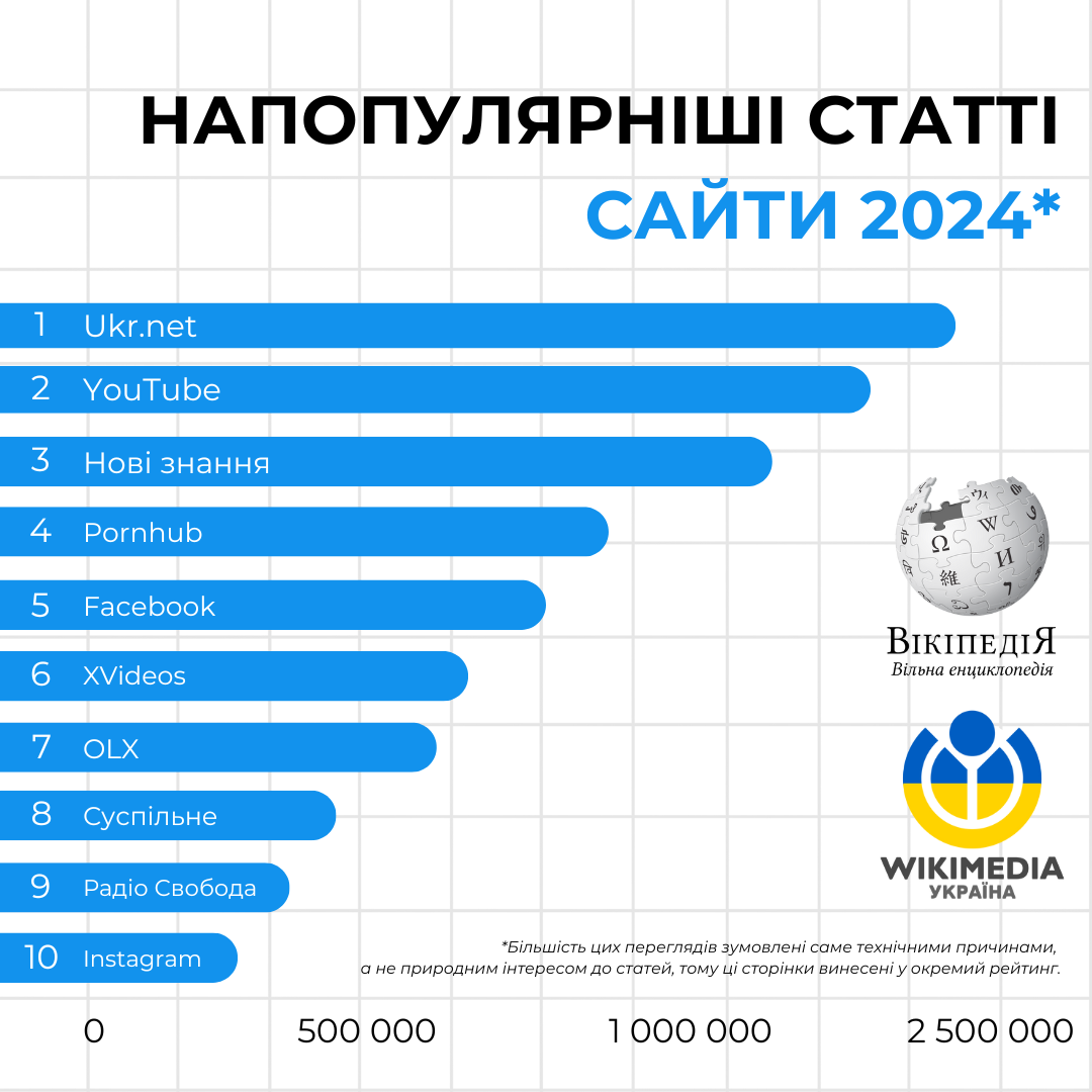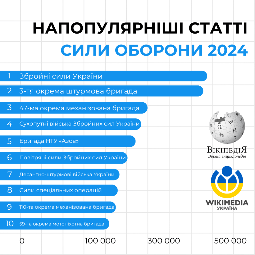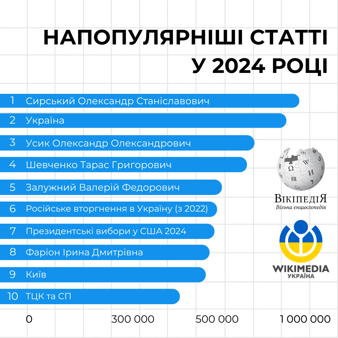 Найпопулярнішою стала стаття про нинішнього Головнокомандувача Збройних Сил Олександра Сирського, за 2024 рік її переглянули понад 1,1 мільйона разів. На другому місці — стаття про Україну, яка отримала понад 1 мільйон переглядів. Третя — стаття про українського боксера Олександра Усика, яку переглянули понад 730 тисяч разів.
