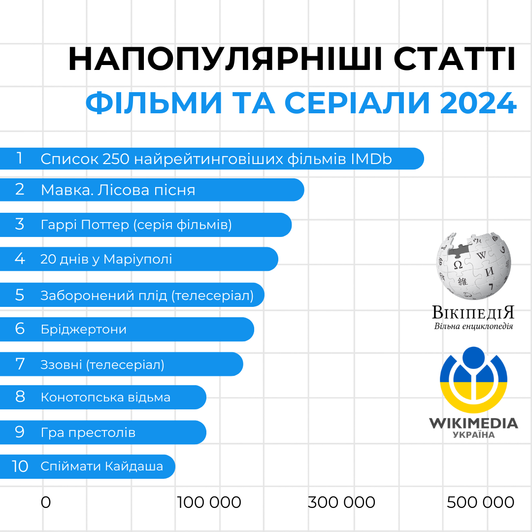 З-поміж статей про фільми та серіали найбільш популярними стали українські стрічки 20 днів у Маріуполі, Мавка. Лісова пісня, Конотопська відьма та Спіймати Кайдаша; серед іноземних — Гаррі Поттер, Бріджертони та Гра Престолів.