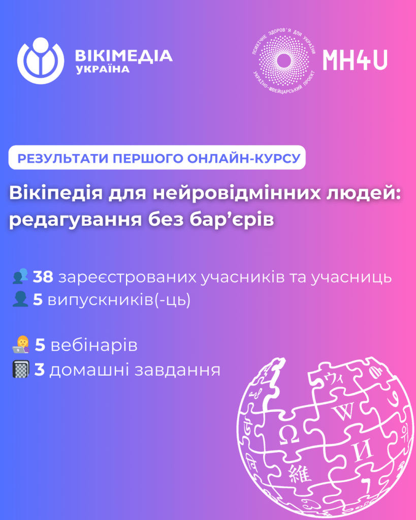 Нещодавно завершився перший в Україні курс з редагування Вікіпедії для нейровідмінних людей! Він реалізовувався в партнерстві з організацією «MH4U — Психічне здоров’я для України». Розповідаємо про те, чому ми його провели, яких результатів досягли і що далі.