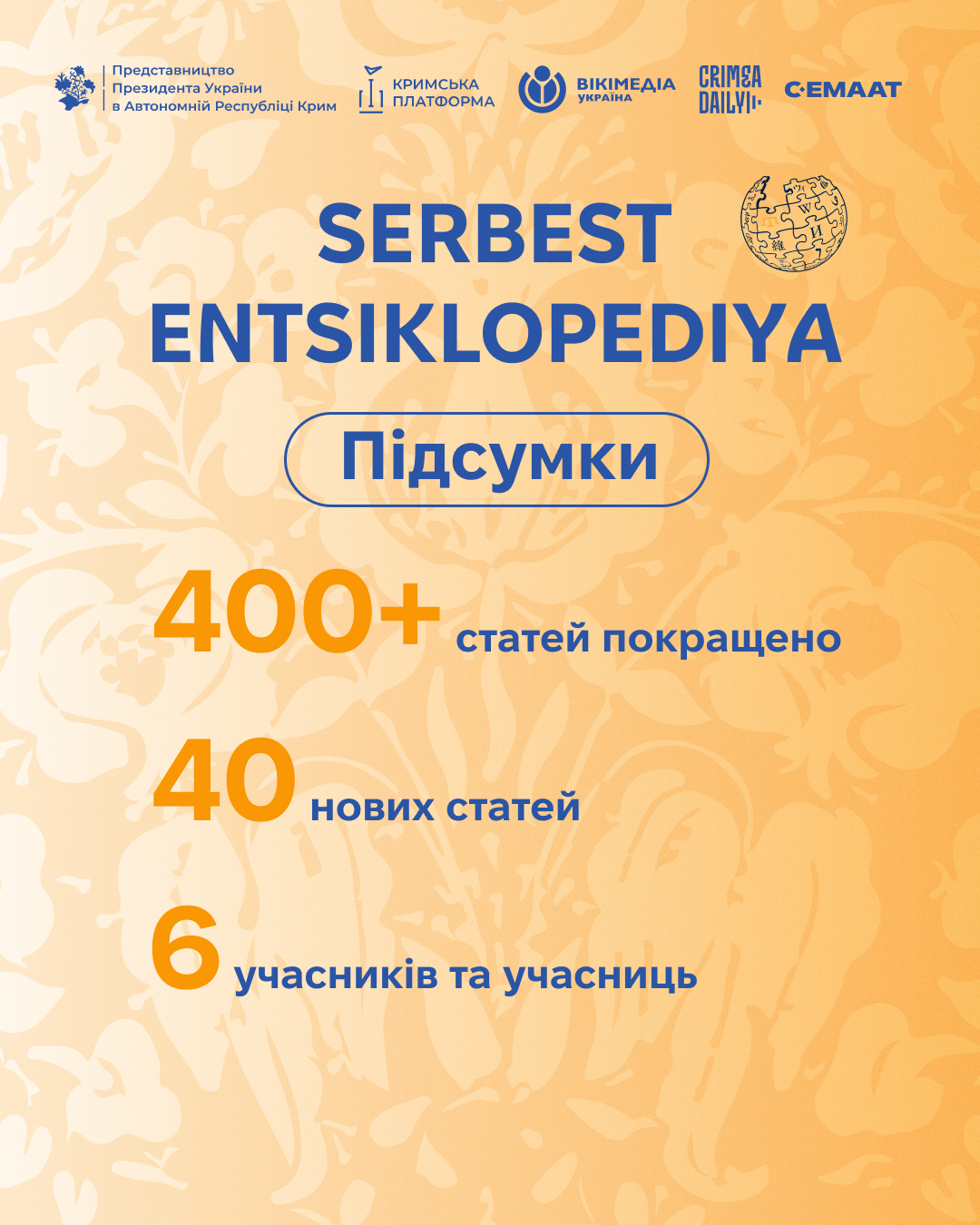 Ми раді нарешті поділитись результатами марафону «Serbest Entsiklopediyа: пишемо кримськотатарську Вікіпедію», присвяченого 17-річчю кримськотатарської Вікіпедії!