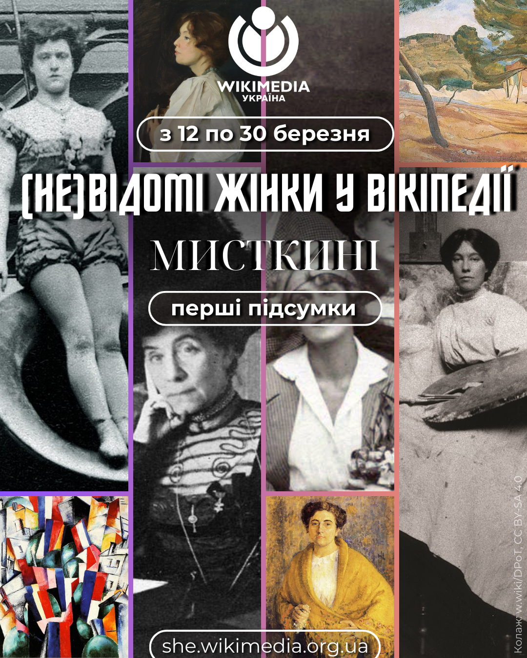 З 12 по 30 березня 2025 року в українській Вікіпедії тривав марафон «(Не)відомі жінки у Вікіпедії. Мисткині». Його мета висвітлення досягнень жінок у мистецтві та популяризація їх внеску в історію та культуру світу. Учасники й учасниці створювали та покращували статті про видатних мисткинь, допомагаючи зменшити гендерний дисбаланс у Вікіпедії.