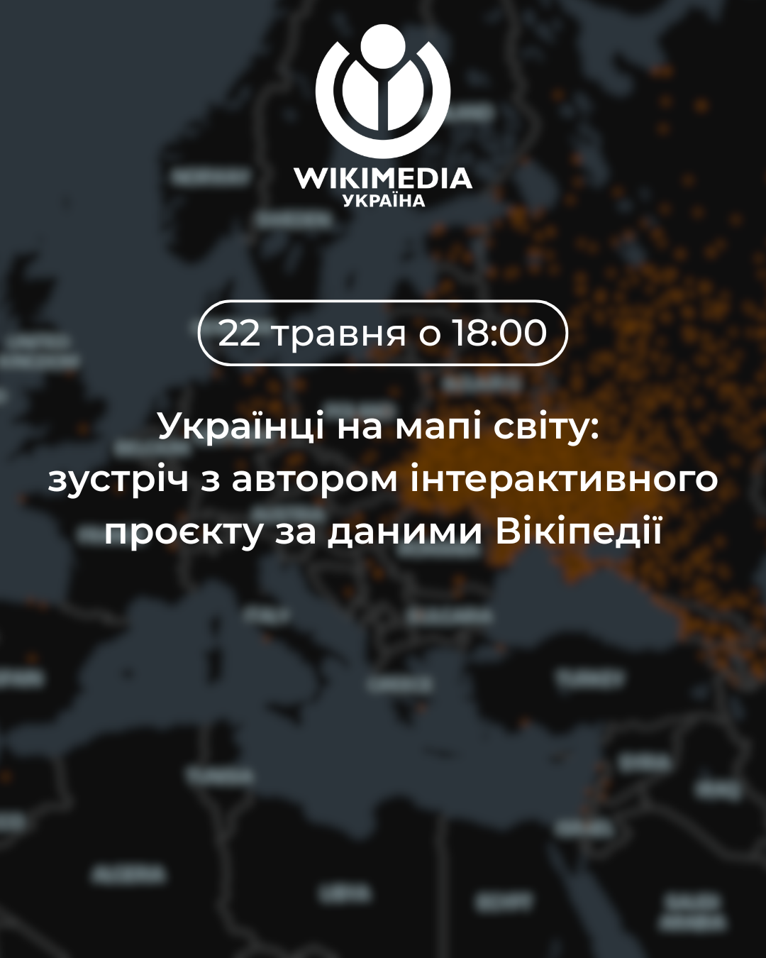 На зустрічі о 18:00 в четвер 22 травня поспілкуємося із Романом Мельником, спеціалістом у сфері аналізу даних та автором проєкту «Українці на мапі світу», який базується на інформації з Вікіпедії (посилання на мапу • детальніше про проєкт)