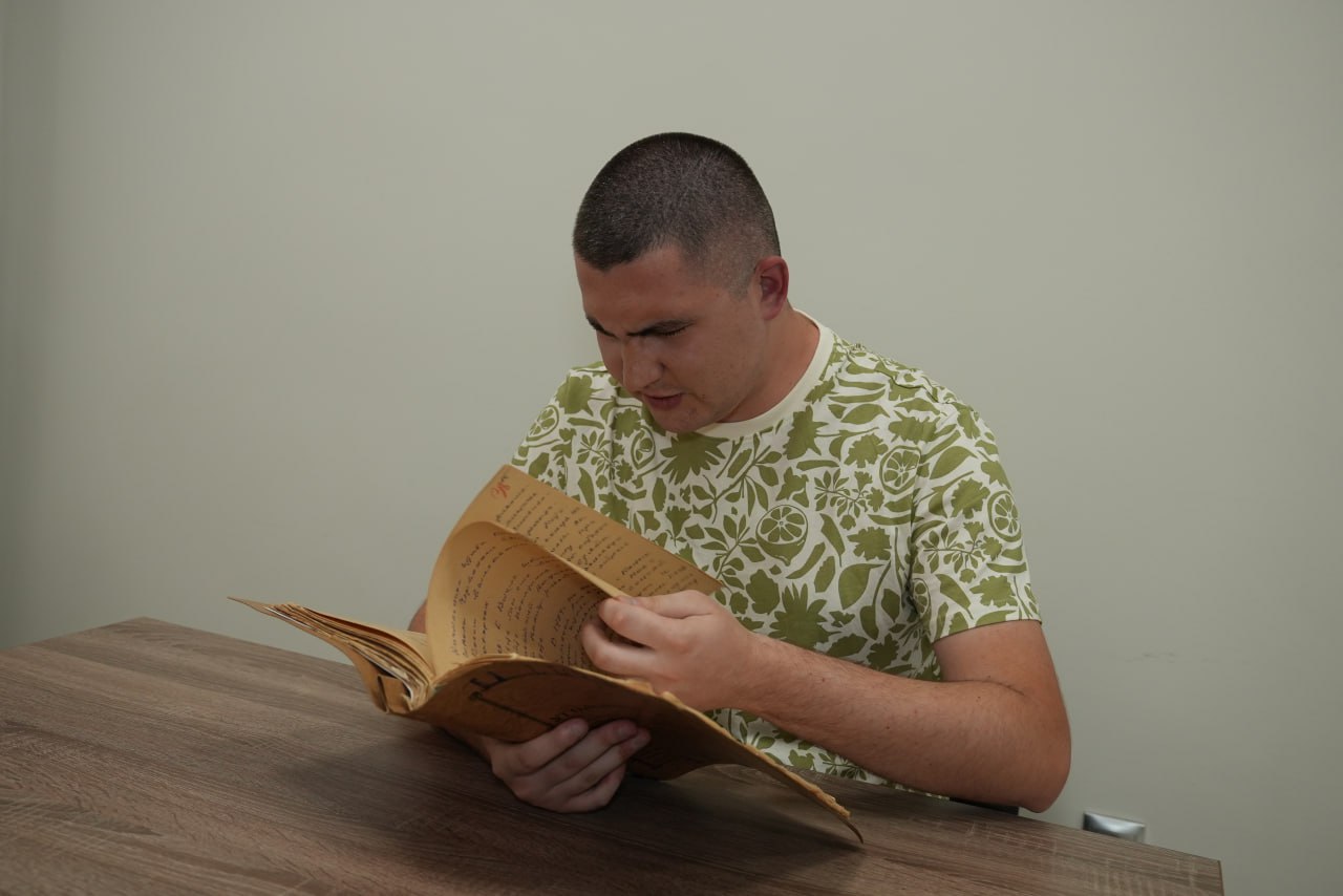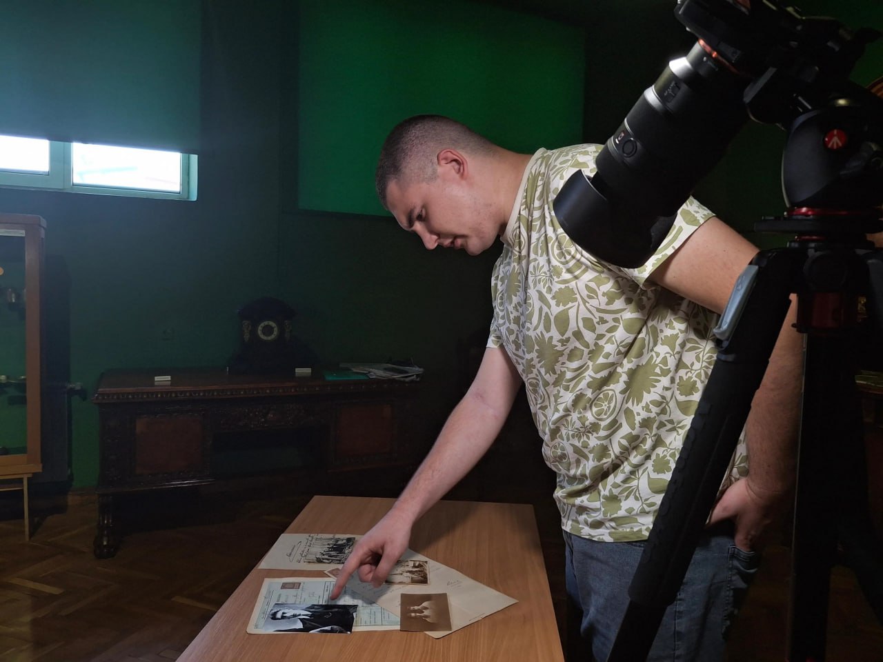 1 — Журналіст Степан Пенкалюк та історик Андрій Бойда під час зйомок сюжету про Юліана Гоїва, Снятин 17 червня 2025; 2, 3 — Андрій Бойда демонструє сімейні реліквії з фондів Івано-Франківського краєзнавчого музею та під час роботи зі справою Юліана Гоїва. Фото з дозволу авторів.