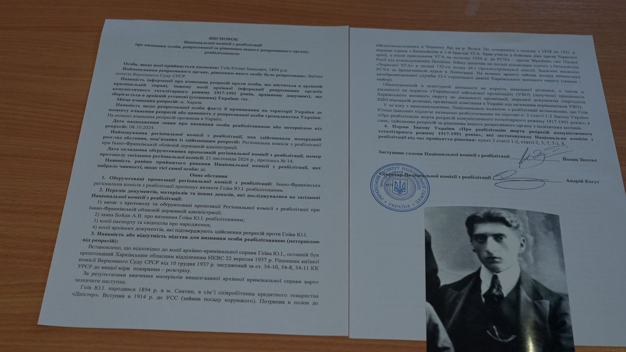 Від статті до статті у наукових виданнях та збірниках конференцій, я поступово наповнював статтю про Юліана Івановича. Паралельно до роботи над нею, тривала і основна робота — посмертна реабілітація Юліана Гоїва. Заяву в регіональну комісію я написав 3 жовтня 2024-го. Її отримав секретар Івано-Франківської регіональної реабілітаційної комісії 8-го числа того ж місяця. Попередній її розгляд відбувся в листопаді того ж року. Мою заяву і попередню рекомендацію регіональної комісії було отримано Національною реабілітаційною в Києві при УІНП в січні 2025-го.