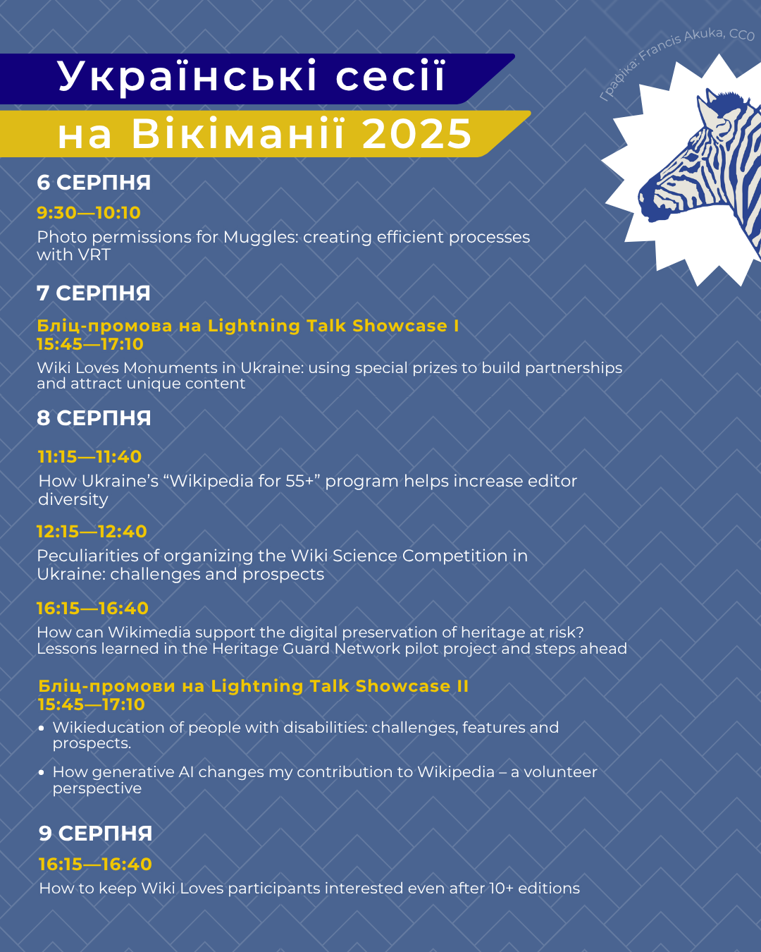 Усі ці сесії та багато інших можна буде відвідати онлайн. Повну програму Вікіманії можна переглянути тут.