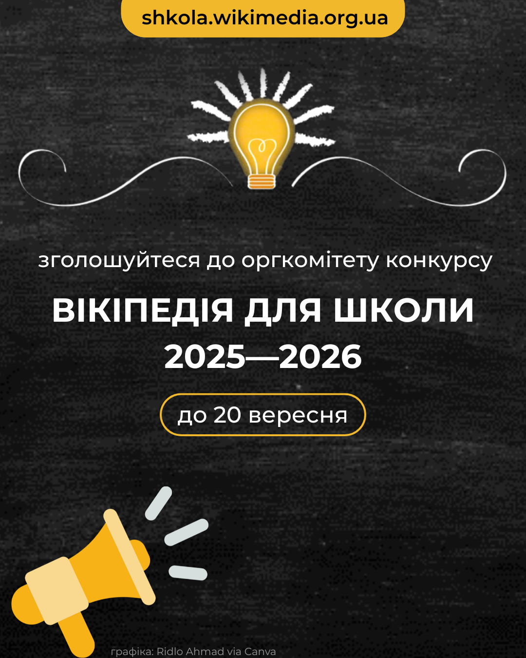 Конкурс «Вікіпедія для школи 2025–2026» — це щорічна ініціатива зі створення й поліпшення статей в українській Вікіпедії на теми зі шкільної програми. Ми шукаємо охочих долучитися до оргкомітету конкурсу та стати частиною команди, яка не лише координує процес, а й впливає на формування освітнього середовища в Україні.