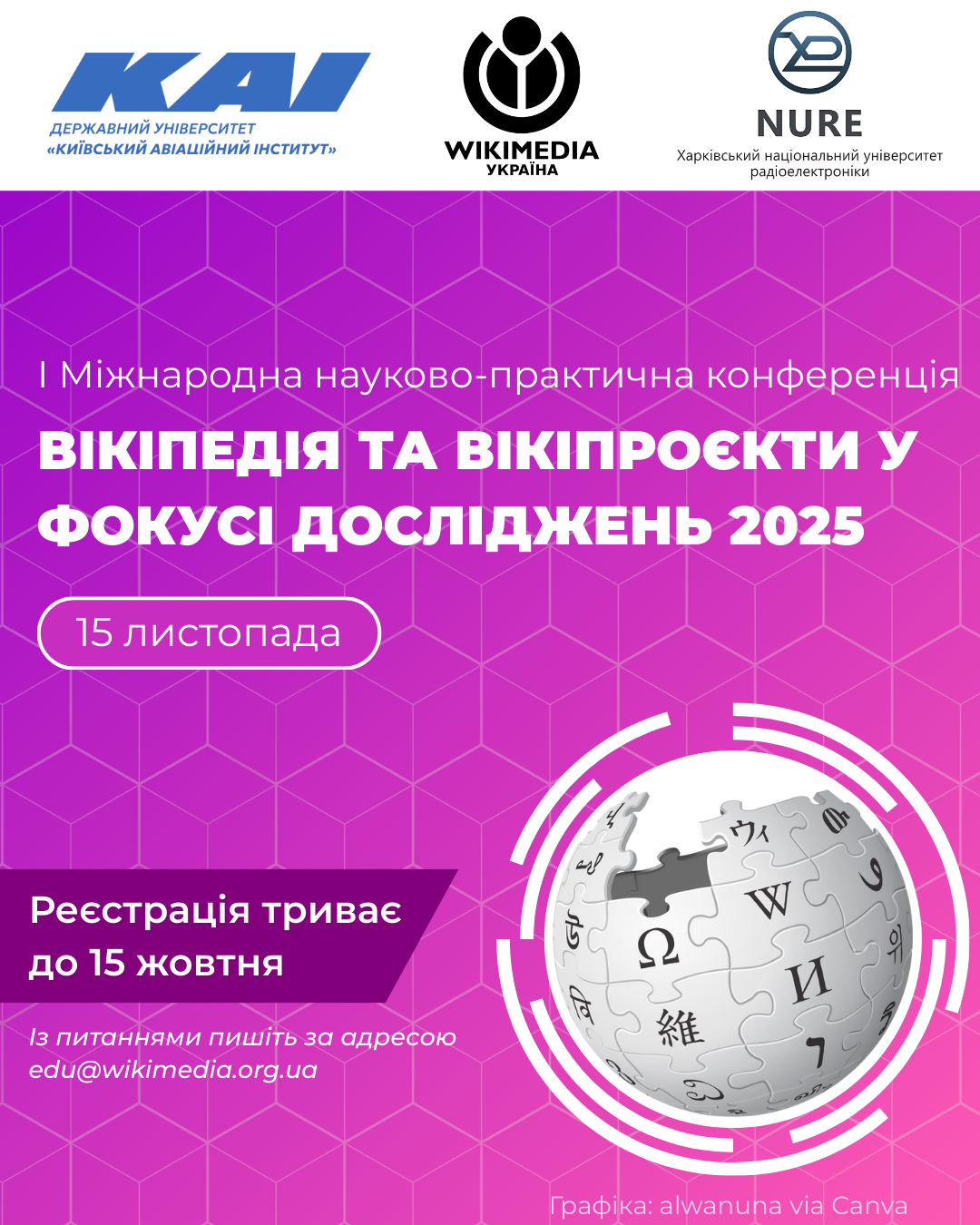 У межах I Міжнародної конференції «Вікіпедія та вікіпроєкти у фокусі досліджень», що відбудеться 15 листопада 2025 року, ми об’єднаємо українських дослідників, які вивчають Вікіпедію, та міжнародних науковців, які досліджують Вікіпедію в контексті України.