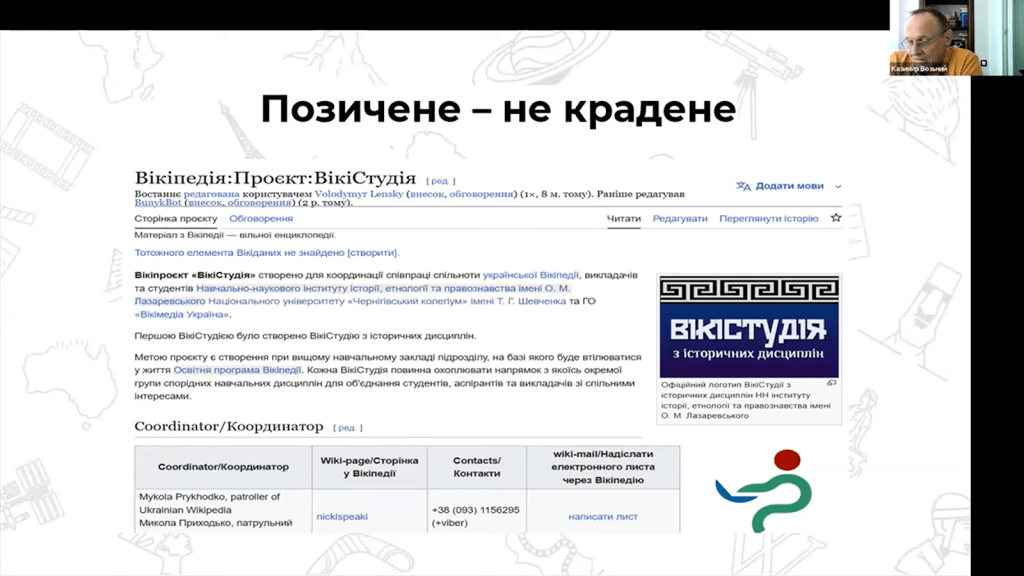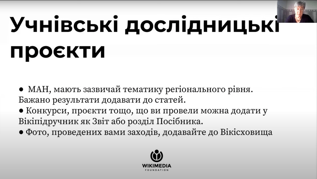 Майя Лазоренко розповіла про свій багаторічний досвід, як через Вікіпедію можна зацікавити учнів географією. Михайло Григор’єв показав приклади створення коротких відео разом з використанням Вікіпедії та штучного інтелекту для вивчення біології.