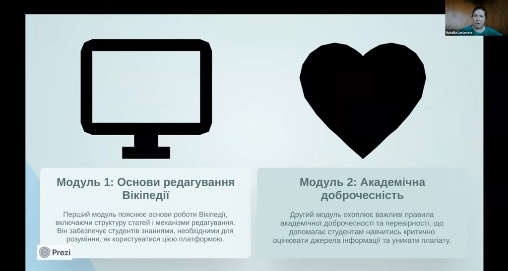 Після короткої перерви Наталія Ластовець розповіла про онлайн-курс «Вікіпедія для початківців», який можуть використати як вчителі, так і їх учні та учениці. Опісля Олена Вінсент презентувала освітню програму Вікіпедії, розповіла про курс «Вікіпедія для навчання» на Prometheus та окреслила ключові напрямки співпраці та можливості.