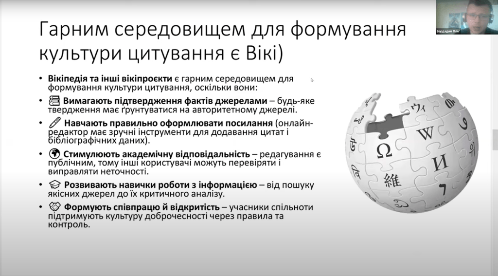 Олег Бардадим висвітлив тему академічної доброчесності, показавши, як редагування статей допомагає студентам формувати чесне ставлення до знань.