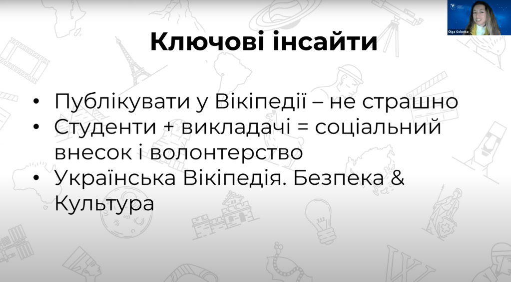 20 вересня ми провели онлайн-конференцію освітян вікіспільноти, яка стала простором для обміну практиками, новими ідеями та натхненням для подальшої роботи. Протягом шести годин 13 спікерів та спікерок ділилися власним досвідом використання Вікіпедії та вікіпроєктів в освітньому процесі. У ролі слухачів та слухачок доєдналися 42 людини.