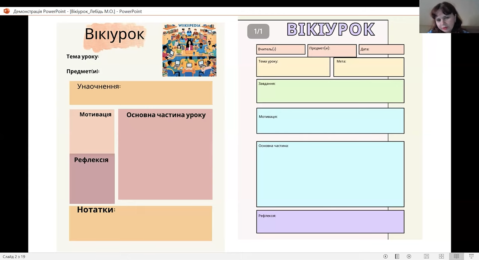 Наступною частиною були практики інтеграції Вікіпедії в освіту. Марина Лебідь поділилася покроковим підходом до планування інтегрованих із Вікіпедією та вікіпроєктами уроків.