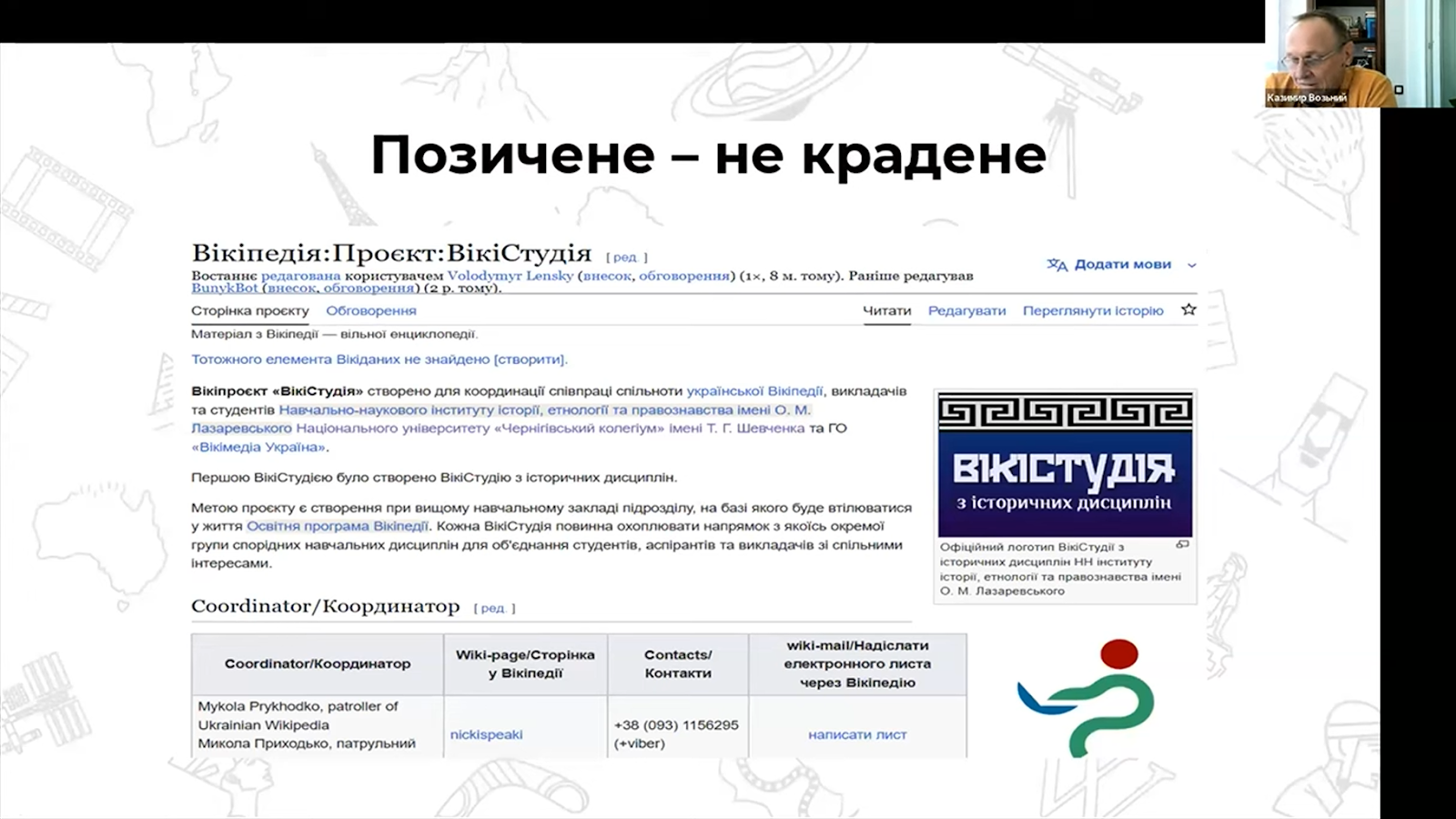Першим виступив Казимир Возьний, який розповів про свій багаторічний досвід впровадження вікістудій в Західноукраїнському національному університеті, який став прикладом системної інтеграції Вікіпедії у навчальний процес.