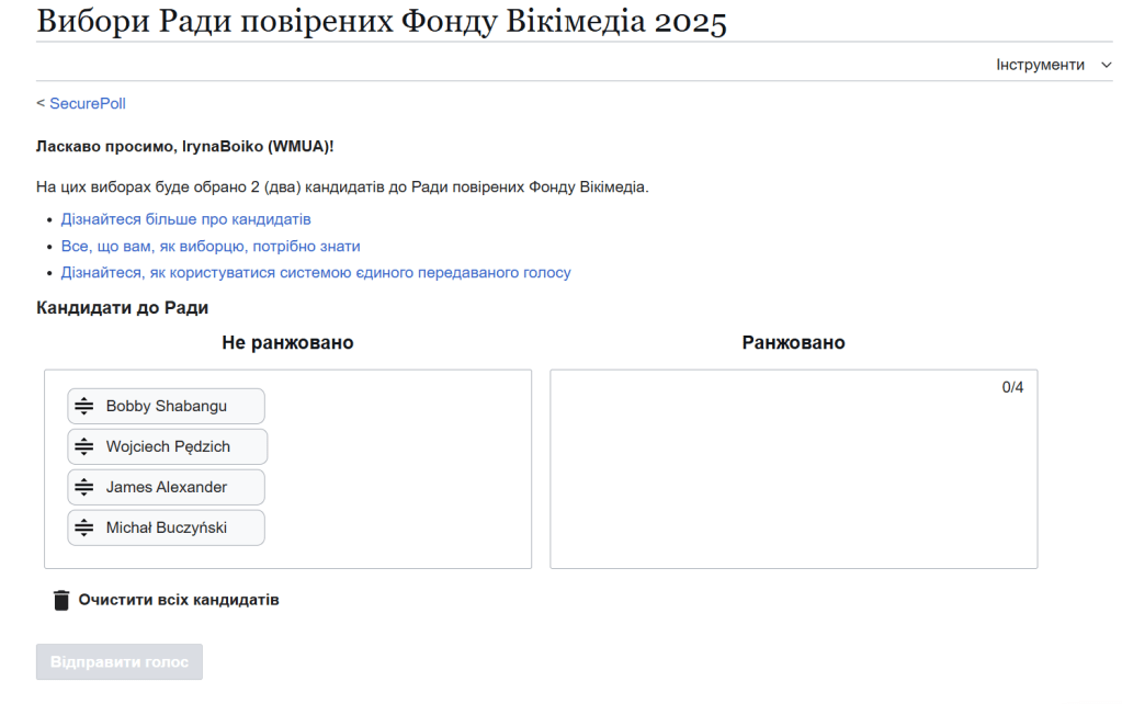 Якщо ви можете голосувати — переходьте на цю сторінку, де вам потрібно буде розставити чотирьох кандидатів по порядку — від найбільш бажаного (1) до найменш пріоритетного (4).