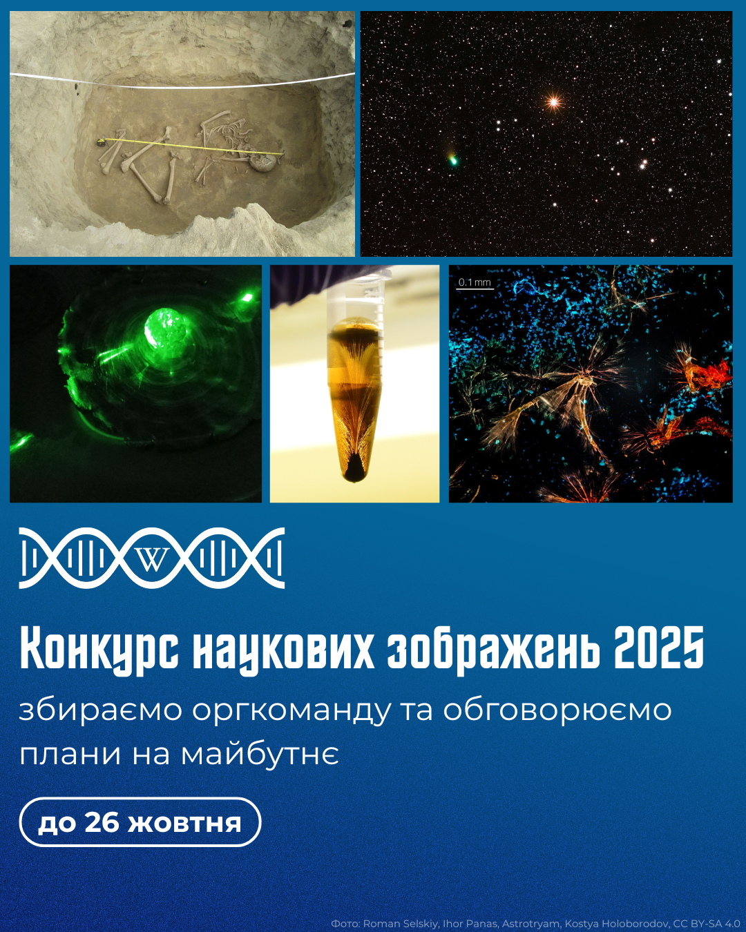 У другій половині листопада 2025 року розпочнеться наш щорічний Конкурс наукових зображень, мета якого — наповнити найбільшу у світі онлайн-енциклопедію та її сестринський проєкт Вікісховище якісними медіафайлами на наукову тематику.