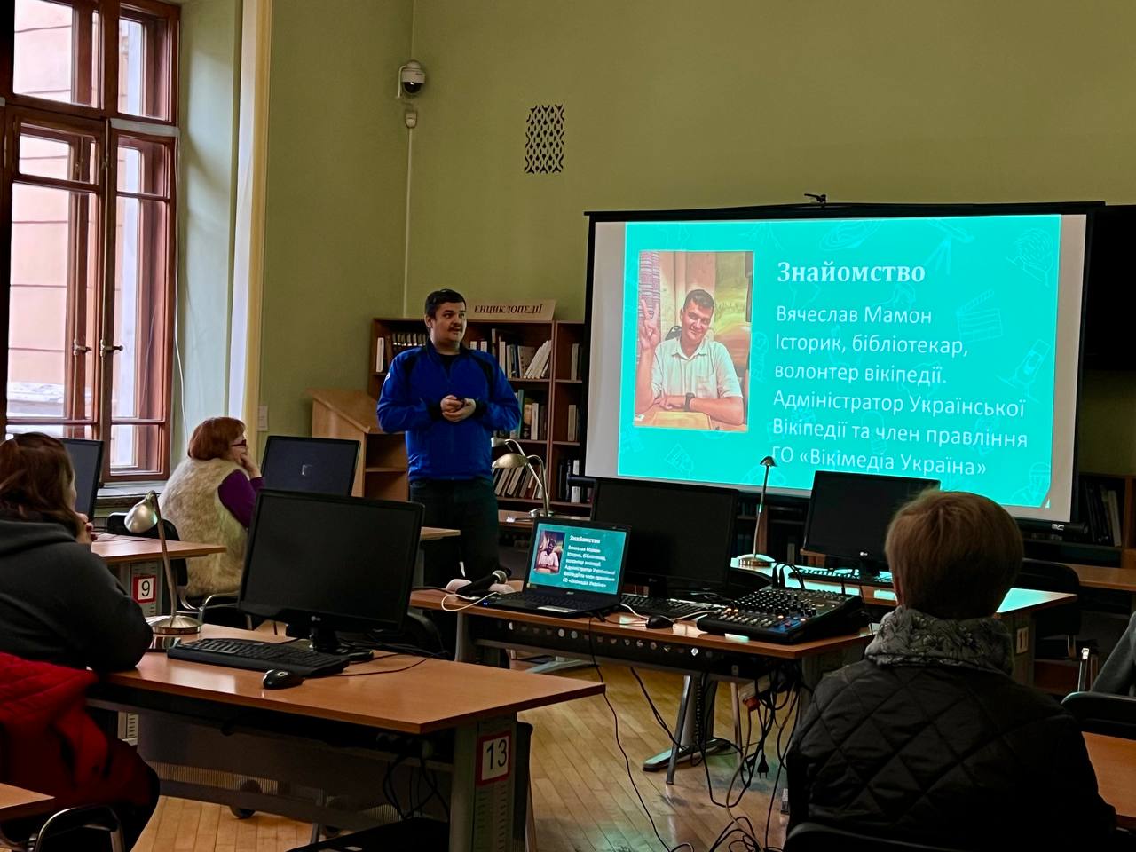 2 жовтня 2025 року в Національній бібліотеці України імені Ярослава Мудрого у Києві відбувся тренінг «Бібліотеки і Вікіпедія». Адміністратор Вікіпедії і член Правління «Вікімедіа Україна» Вячеслав Мамон розповів, як редагувати Вікіпедію, додавати ілюстрації та працювати із зображеннями, а також поділився натхненними прикладами співпраці бібліотек з проєктами Вікімедіа у світі. У заході взяли участь 15 бібліотекарок та бібліотекарів.