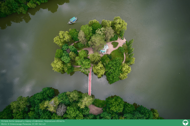 «Фото Черкаської області я зняв у парку “Софіївка”. Літав над парком у пошуках незвичного ракурсу й помітив цікаву геометрію острова. Дочекався, поки кораблик підпливе в потрібне місце, і зафіксував цю красу на фото», — розповів Олександр.