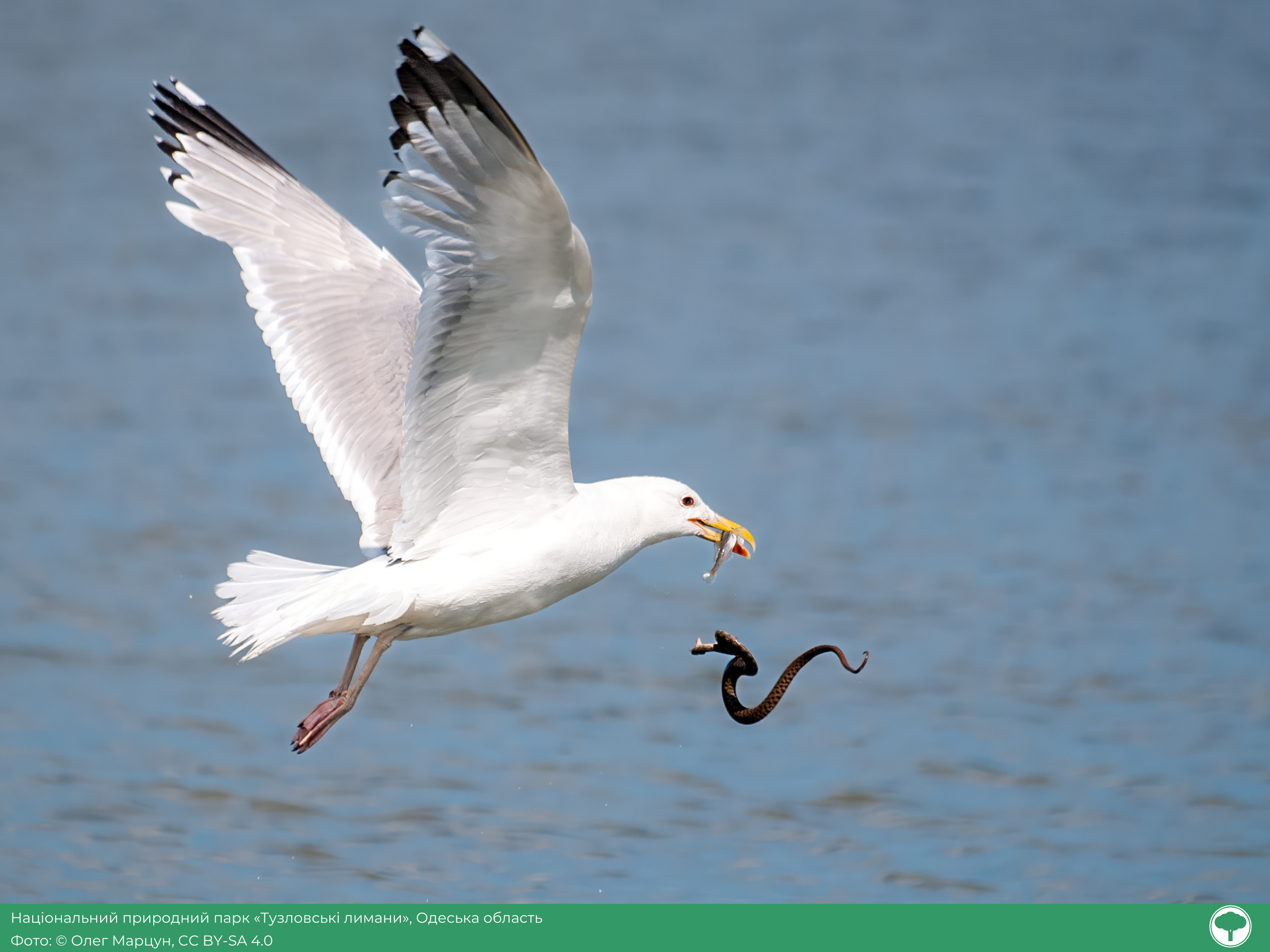 «На озері Малий Сасик, у Тузлівських лиманах, я натрапив на справжній “вужачий шведський стіл”. Десятки водяних вужів то тут, то там випливали з уловом — хто з бичком, хто з камбалою, а хто й з карасиком, як із трофеєм року. І саме один такий герой спіймав досить великого карася. Змій подиву гідний: тримає здобич, як чемпіон, але чи проковтнув він того гіганта — загадка. Пірнув у воду й більше не показався. На згадку залишив лиш цю світлину», — розповів автор фото Олег Марцун.