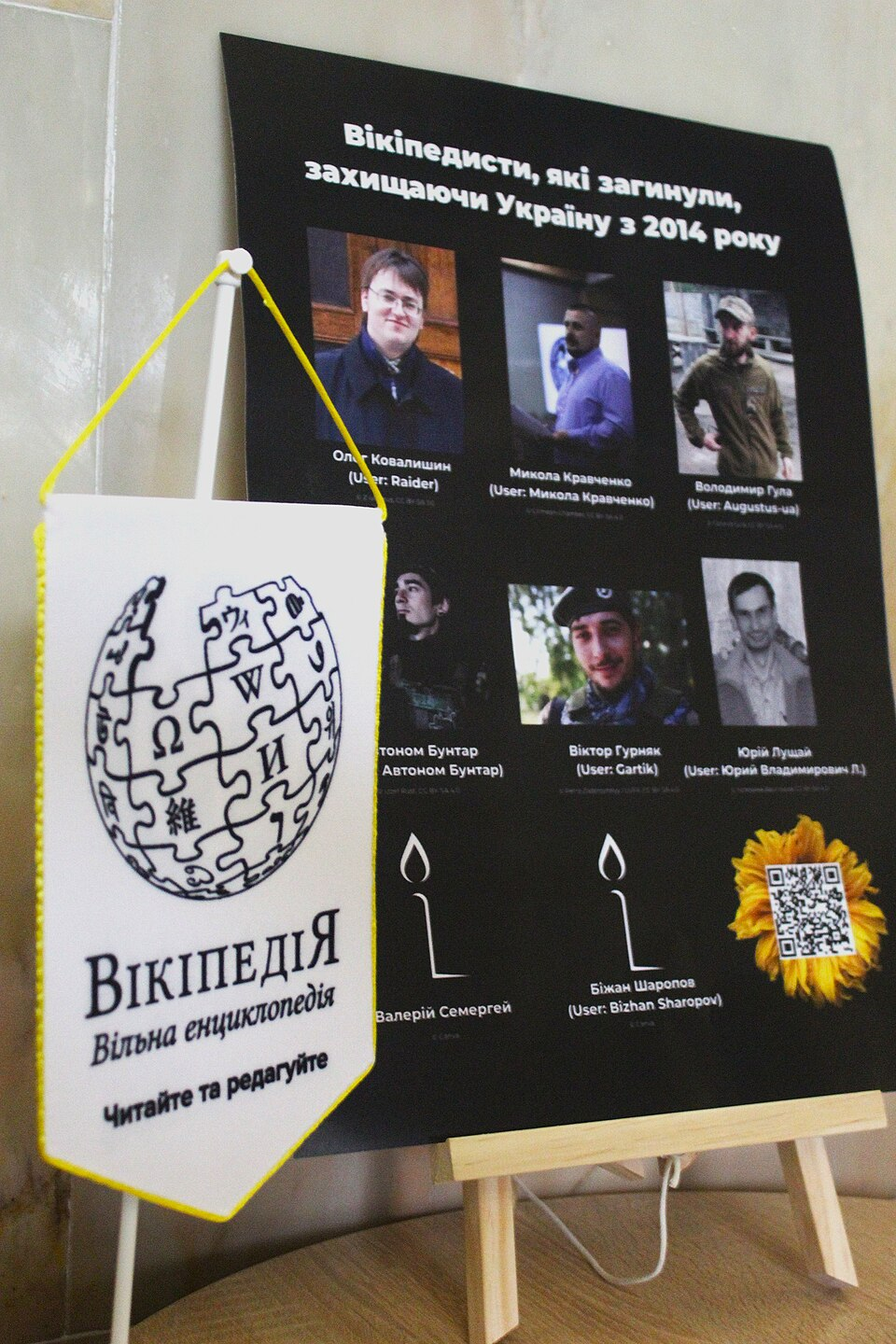 Також на іншому столику ми поклали листівки, буклети та інші роздаткові матеріали, які могли брати усі охочі. Окремо ми влаштували невеликий меморіальний стенд, де протягом дня усі могли підійти та вшанувати пам’ять вікіпедистів, які загинули, захищаючи Україну, а також прочитати їх історії за QR-кодом.
