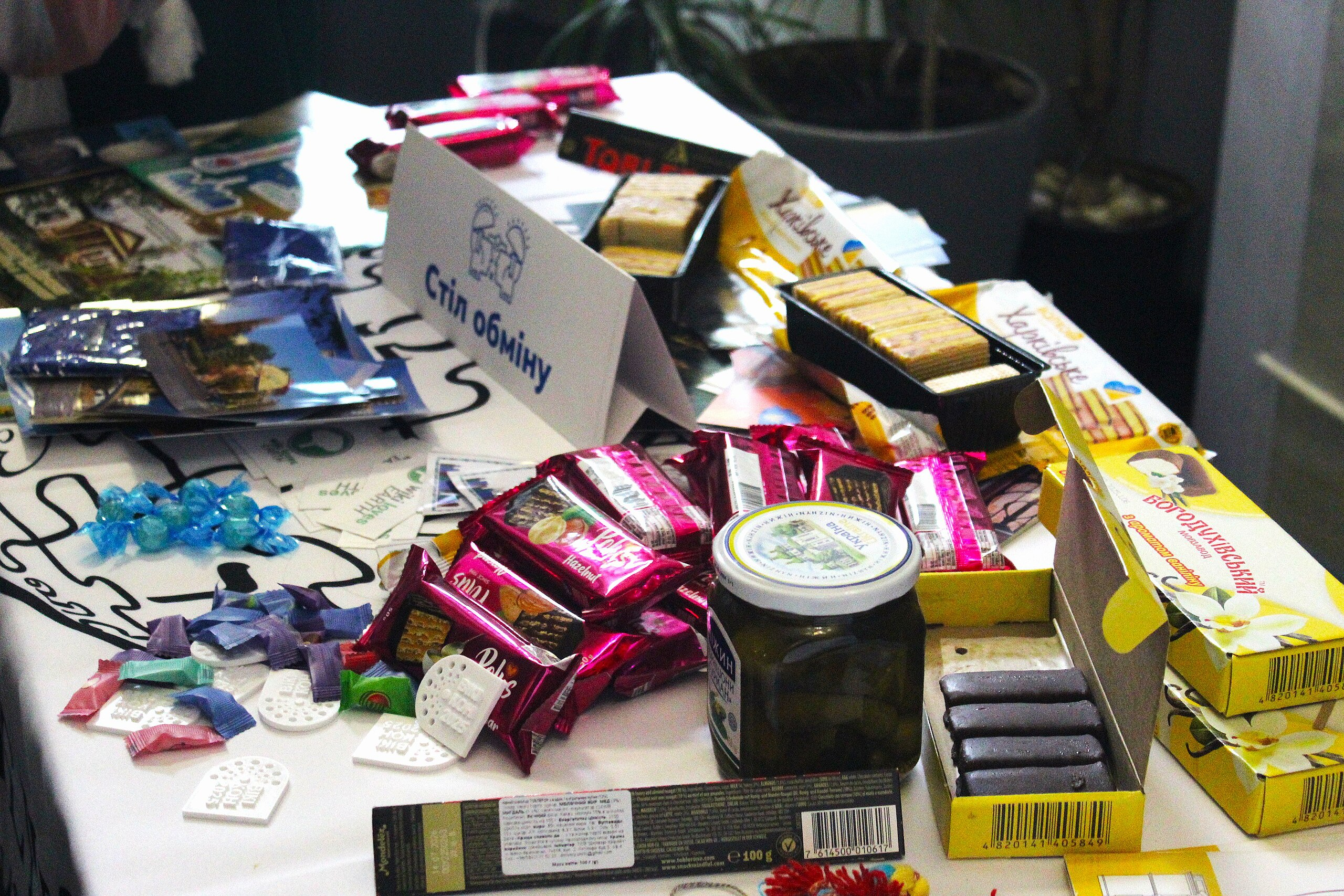 Новинкою на Вікіконференції цього року став стіл обміну — добра традиція міжнародних конференцій, яку ми вирішили втілити й у нас. Учасники та учасниці приносили щось пов’язане з їх регіоном чи просто те, чим вони хотіли поділитися з іншими: цукерки, сирки, батончики, навіть (ніжинські) мариновані огірки, стікери, книжки, дзвіночки, листівки та багато іншого.