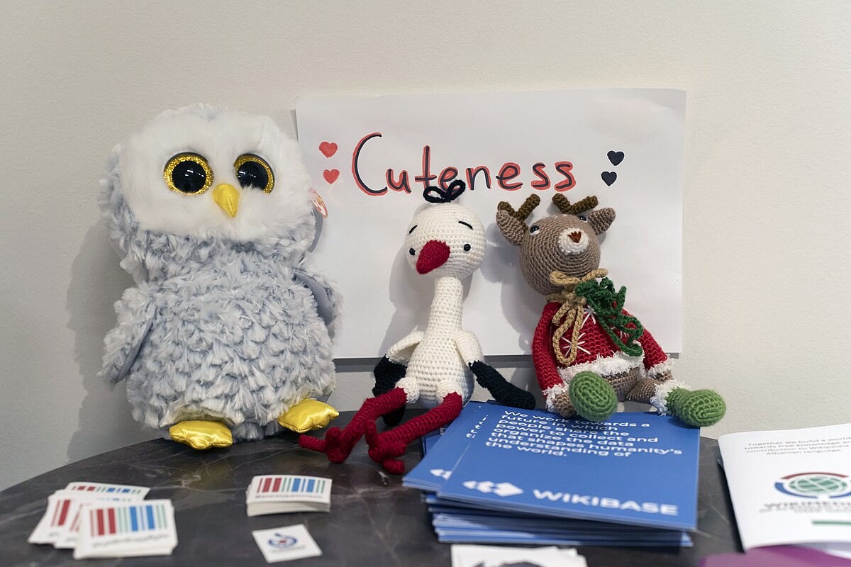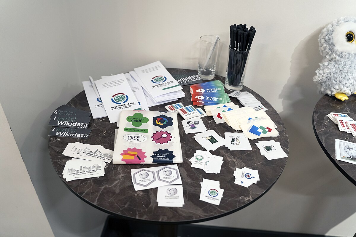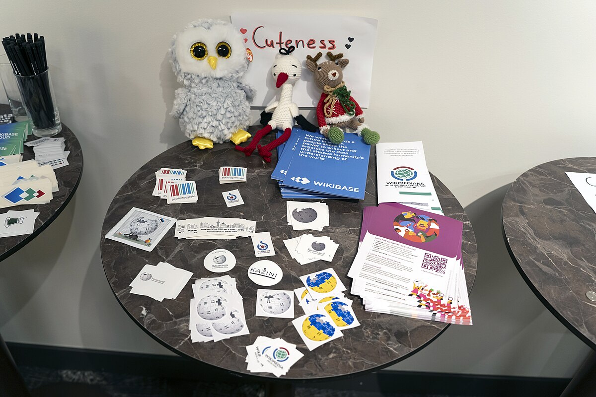Уже на основному столі обміну викладали монетки з різних країн, стікери з офіційною айдентикою конференції, листівки з фото «Вікі любить Землю» та багато іншого. Поруч також розташувалися плюшеві іграшки — учасники Wikimedia Cuteness Association.